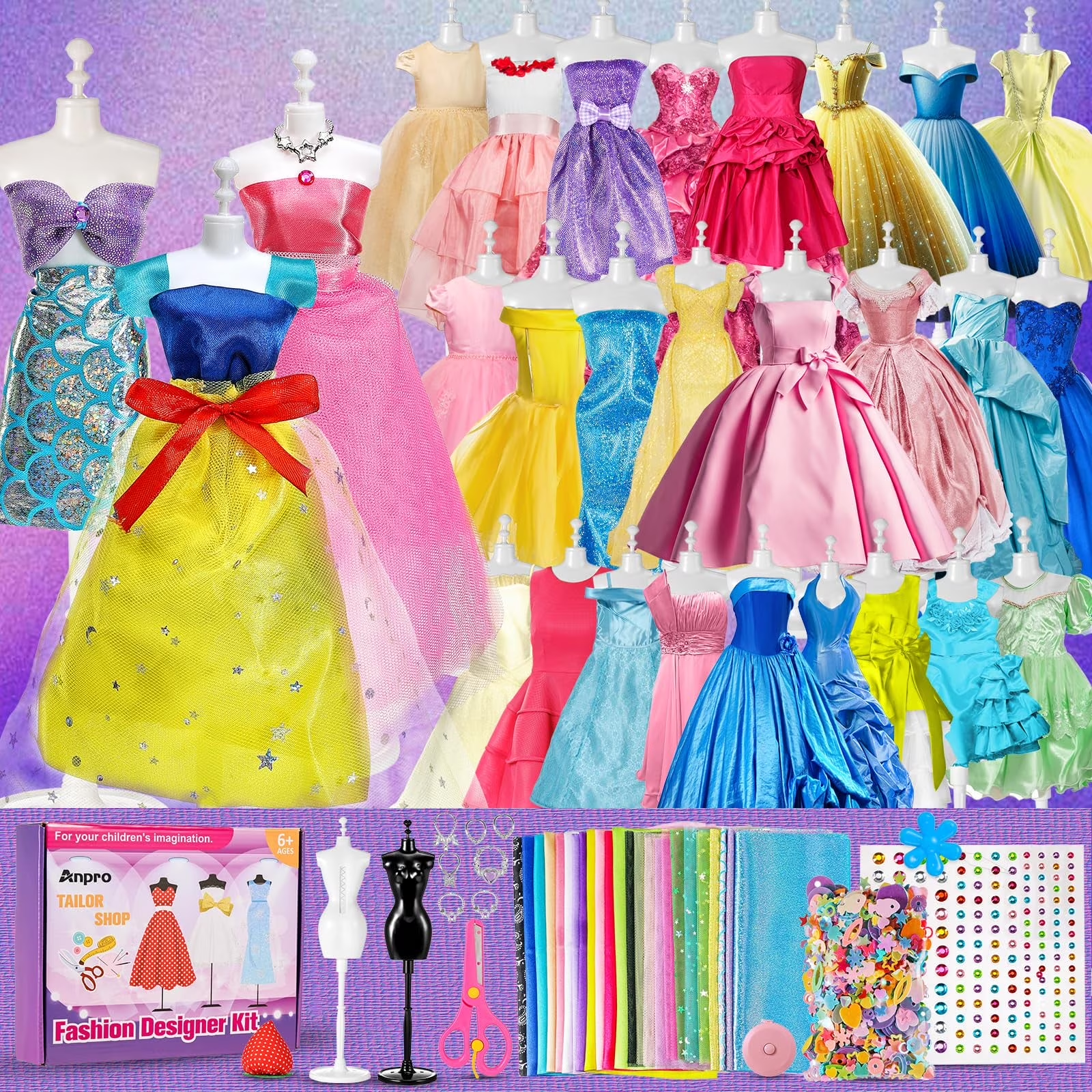 Princess Designer Kit: Unleash your creativity with over 650 pieces to create over 80+ outfits. This set includes 24 pieces of fabric, 2 mannequins, 10 satin belts and lace trims, a template, craft scissors, sewing tools, rhinestones, sequins, necklaces, hook & loop tapes, elastic bands, a water-soluble pen and a step-by-step manual.