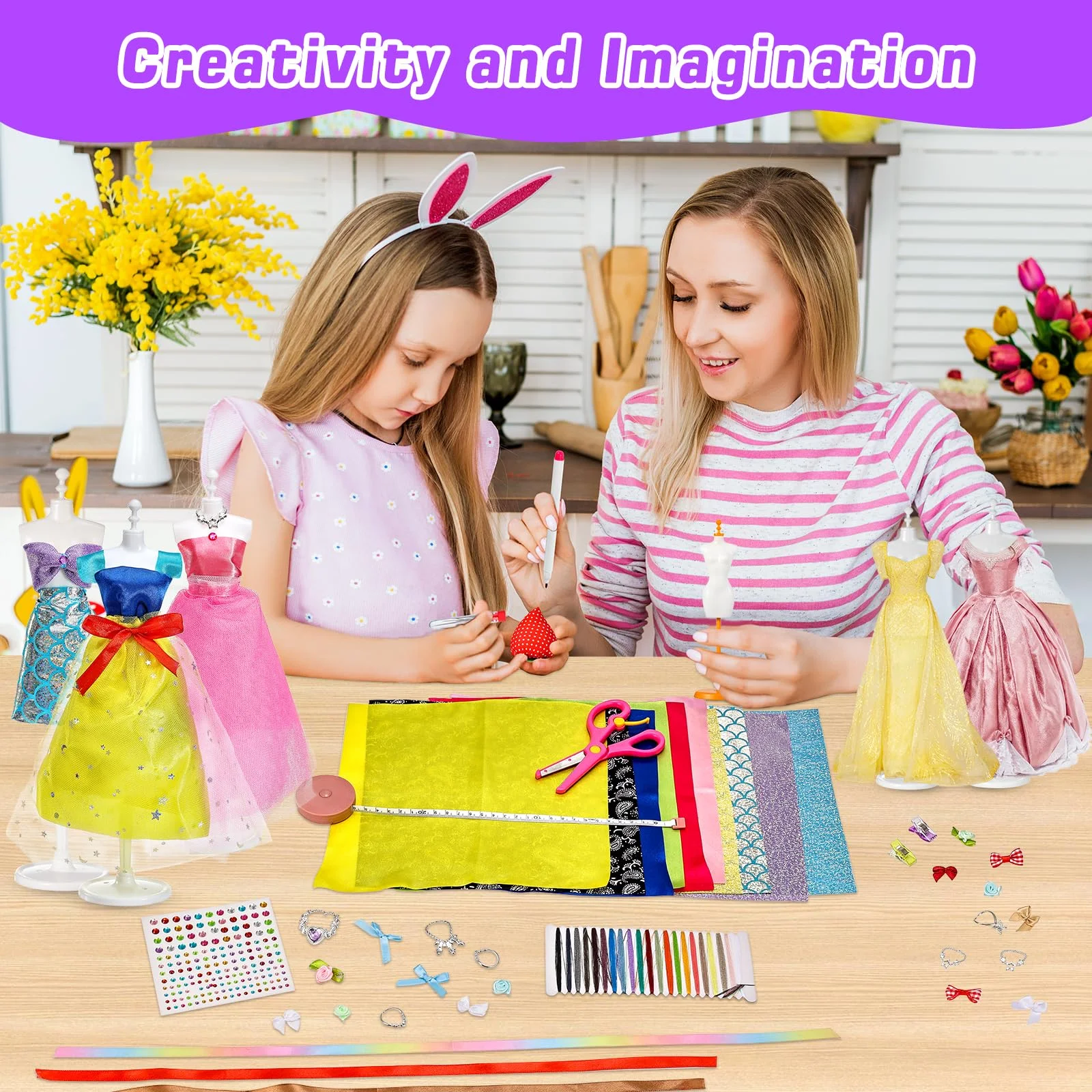 - Includes 2 mannequins, 24 fabrics, 10 satin belts and lace trims, scissors, sewing tools, and various decorating accessories