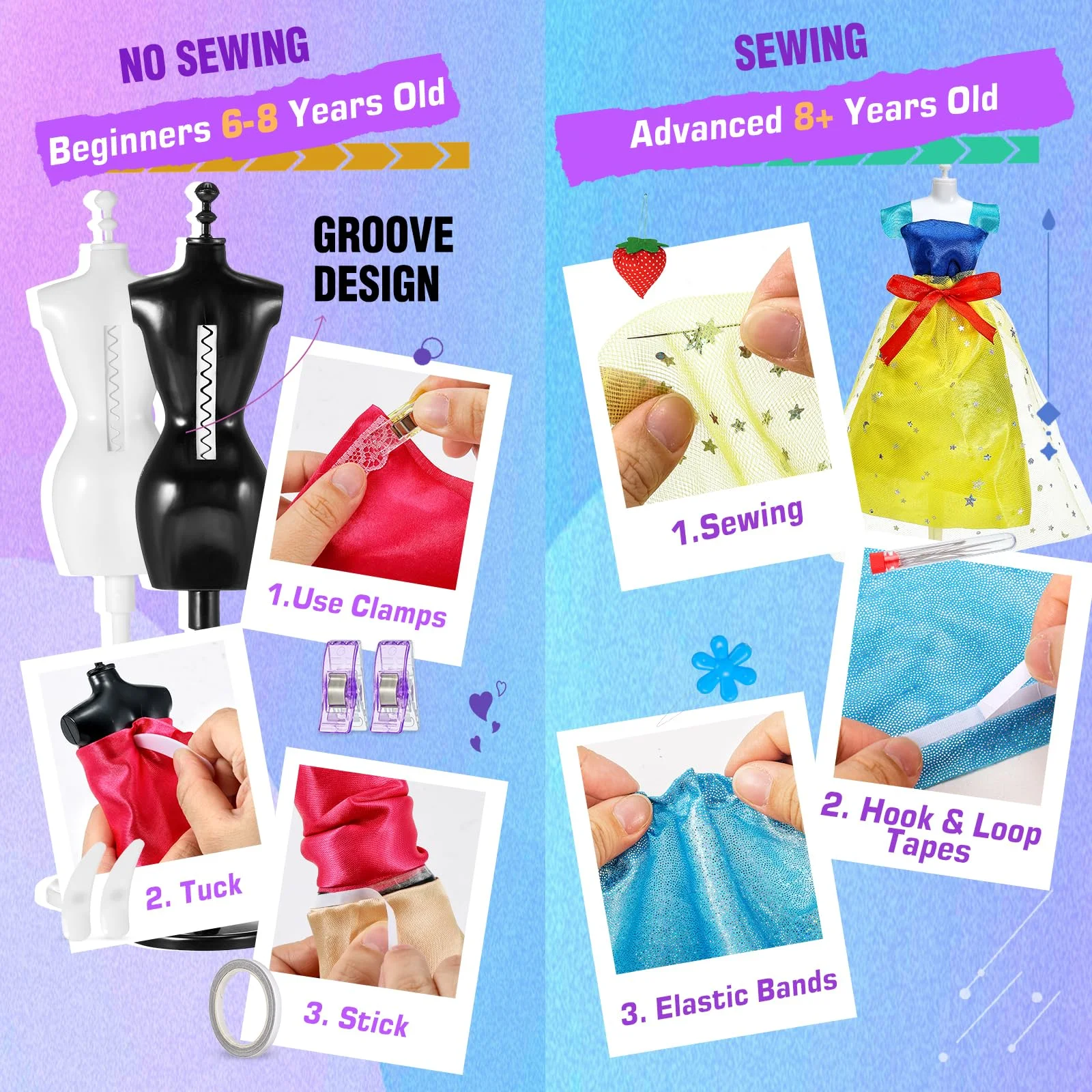 Suitable for All Skill Levels: Beginners (Ages 6-8) can create without sewing thanks to mannequins with a groove-back design, while advanced creators (Ages 8+) can use the included needle and thread for precise fashion crafting.