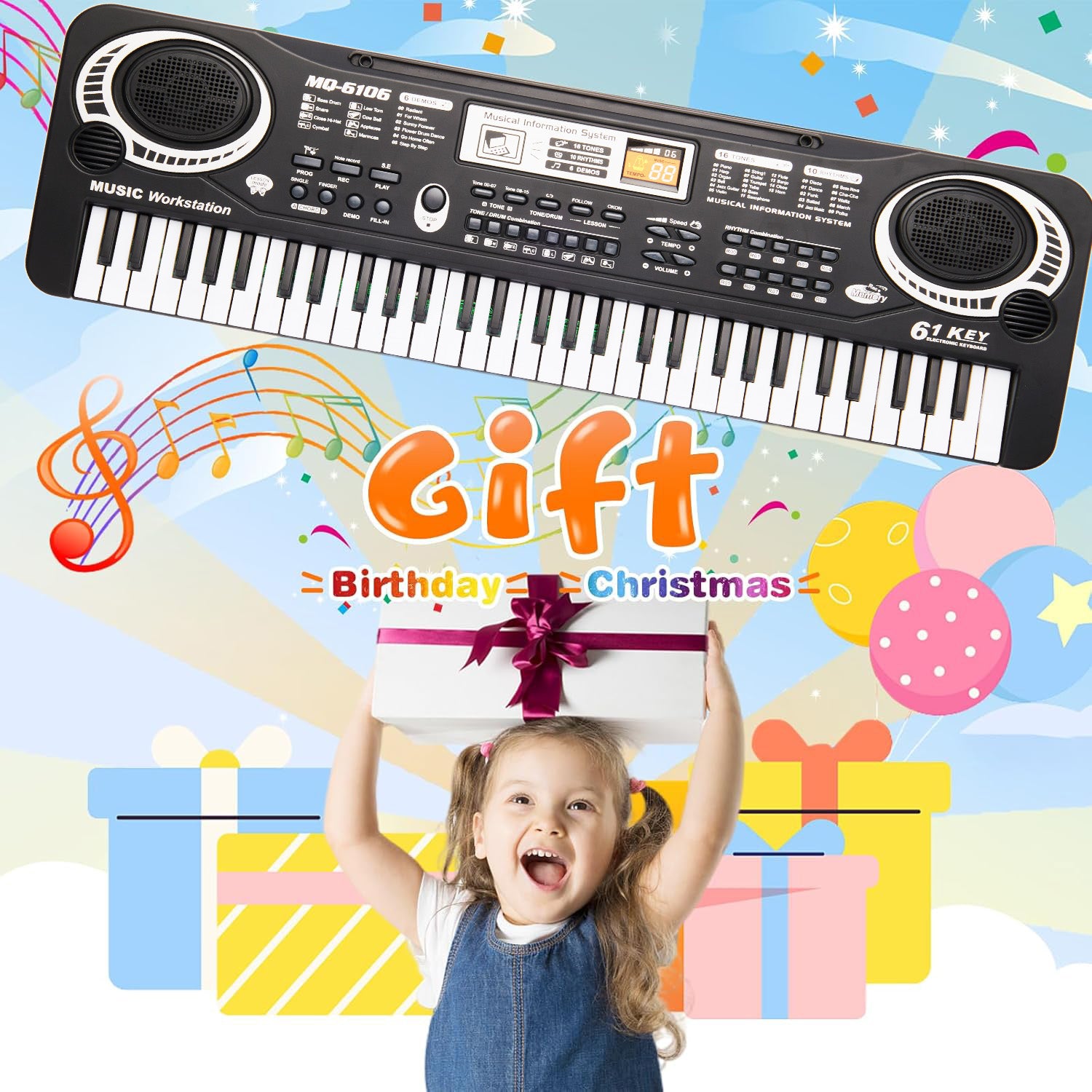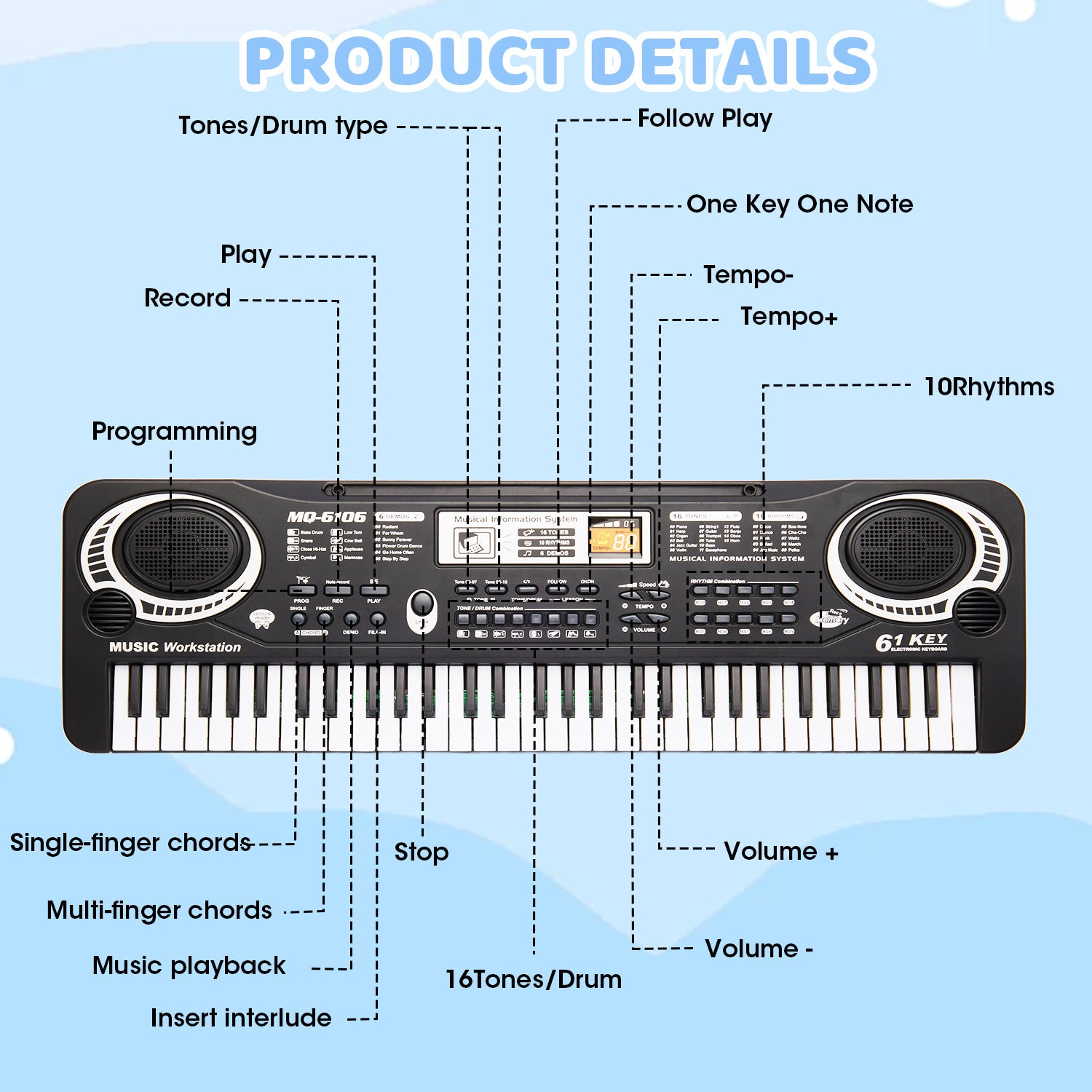 - Multi-functional 61-Key Piano Toy - There are multi-function for this piano toy: 6 English Demo Songs, 16 Tones, 10 Rhythms, 8 Percussion Instruments, 2 Learning Function, Sound Control, Recording, Chords, Volume Adjustment, Fill-in, Beat Speed, Microphone, Program, Follow and so on.