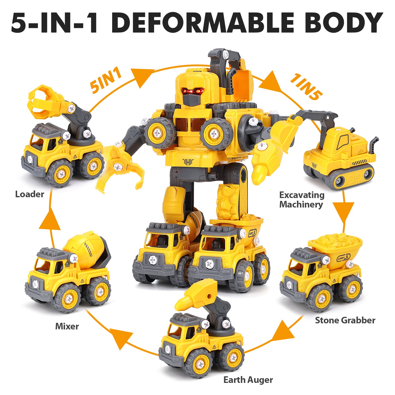- 5 in 1 Robot Construction Vehicle Toy: Transform toys robot made with 5 take apart construction cars toys: Construction trucks with drill, excavator, construction vehicles with grappling, cement mixer, truck. Great construction vehicle toys suitable for 3 + year old boys.