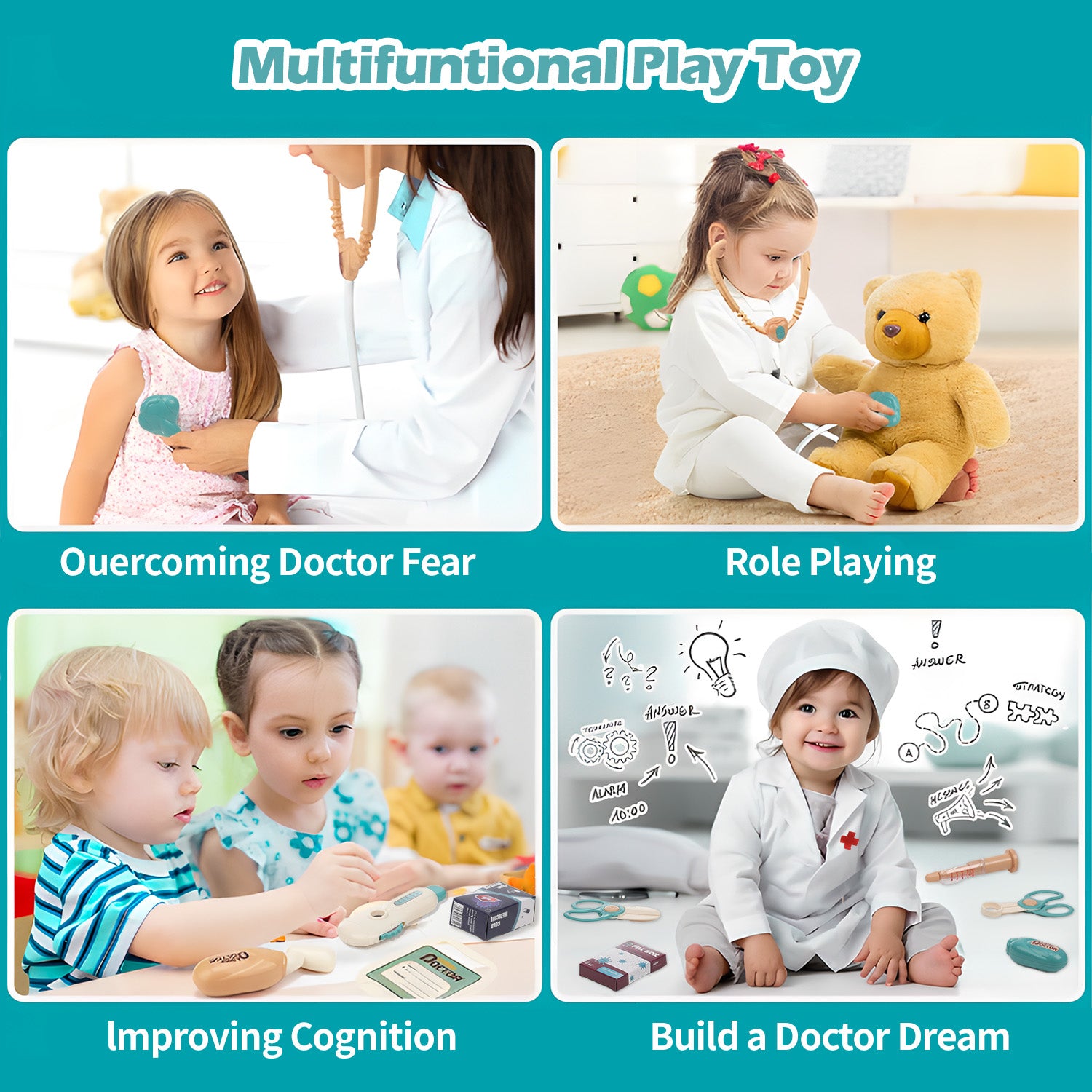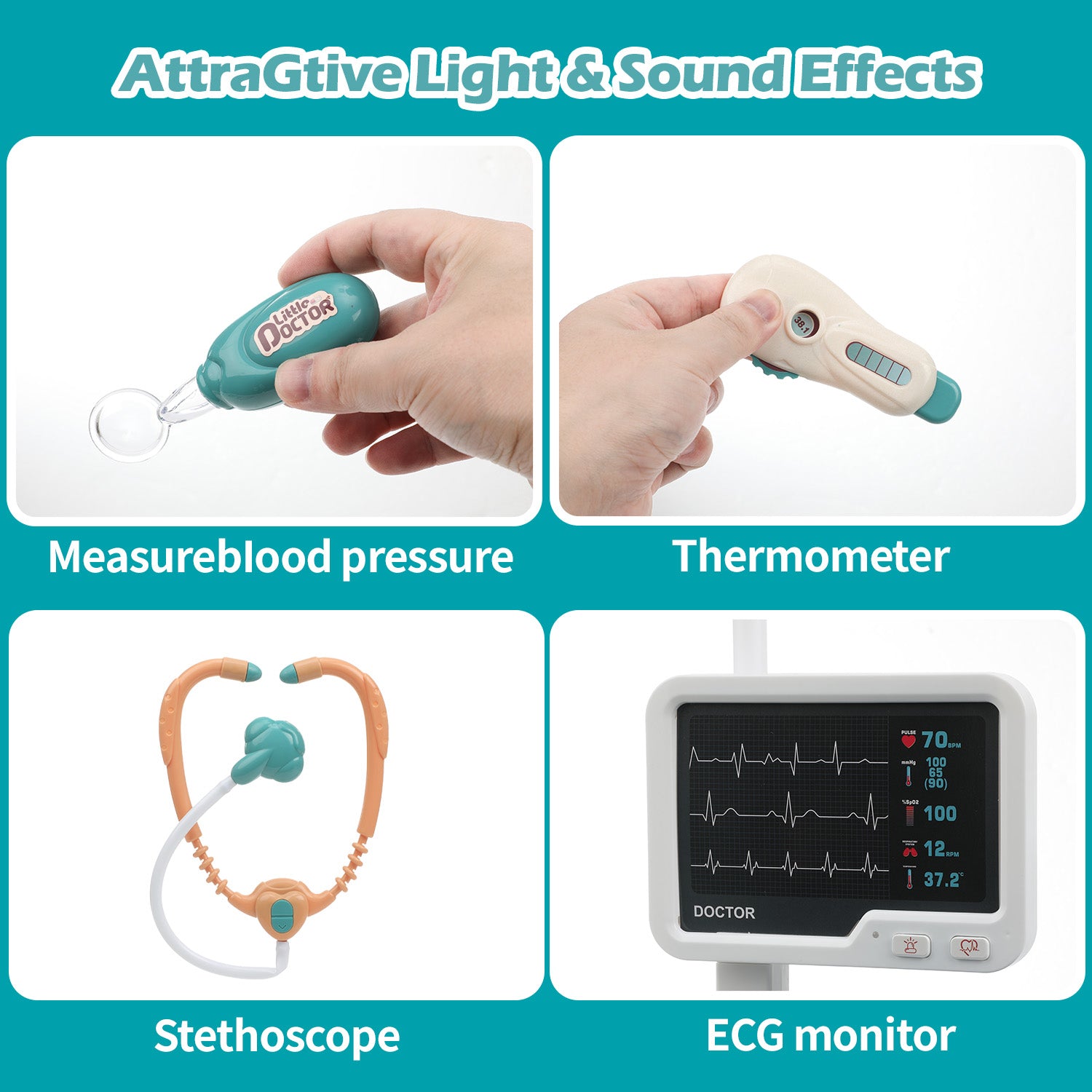 - Education Medical Station Toy: Foster your child's learning and development through engaging pretend play. With our doctor set, children can step into the roles of doctors and nurses, donning the doctor coat and using the stethoscope to examine and treat their "patients." In the process of the game, doctor kit toddlers 3-8 years cultivates children's interest in learning medical health knowledge and adds fun to parent-child interaction.